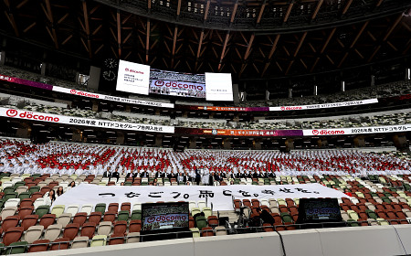 NTTドコモグループの入社式。東京・MUFGスタジアム(国立競技場)に白と赤の衣装を着た新入社員1390人が集結。「NTT docomo」を人文字で表現し、企業ロゴ人数のギネス世界記録を更新した=1日 【時事通信社】